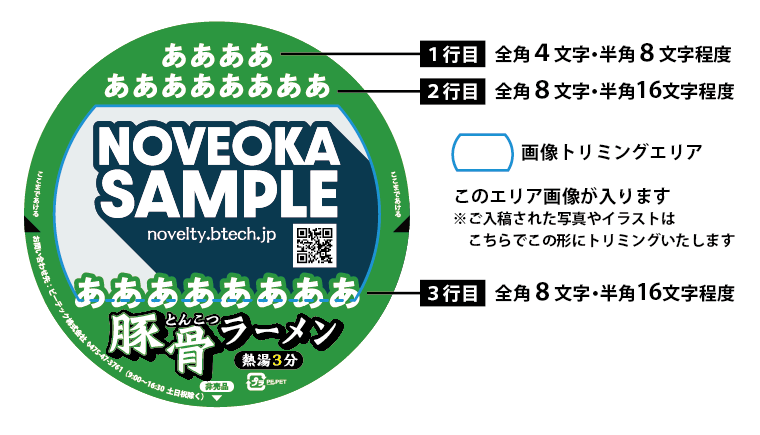 スーパーカップ1.5倍とんこつラーメンのシール蓋に、あなたのデザインした絵柄や写真、文字を入れられるサービスです。おなじみのカップ麺をオリジナルのシール蓋にして渡せば特別なギフトになること間違いなしの一品です。会社や学校のイベント、ショップの記念品、家族やペットの大切な記念にカップ麺是非、ノベオカのカップ麺をご利用くださいませ。数種類のポークエキスを使用し、まろやかに仕上げた豚骨スープです。ガーリックをアクセントに利かせることで、後を引く美味しさに仕上がっています。風味の良いごま、揚げ玉、ねぎ、キクラゲが入っています。注文方法は簡単。ご注文フォームに沿って指定の箇所のテキスト、画像をアップロードするだけ。しかも12個から注文可能です!ノベオカのカップ麺は、既存の商品の上蓋にお客様オリジナルデザインのシールを貼りシュリンク包装する仕様です。また、商品のカップ側面は既存のままとなります。