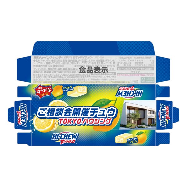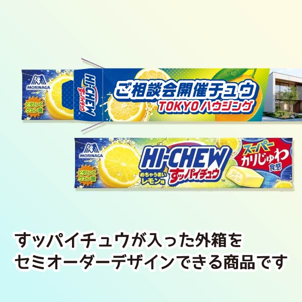 森永「ハイチュウ(すッパイチュウ)レモン味」が入った外箱に、写真やイメージ画像を印刷できるタイプです。 ロゴだけでは伝えきれない世界観や雰囲気を、お菓子のパッケージで表現できます。