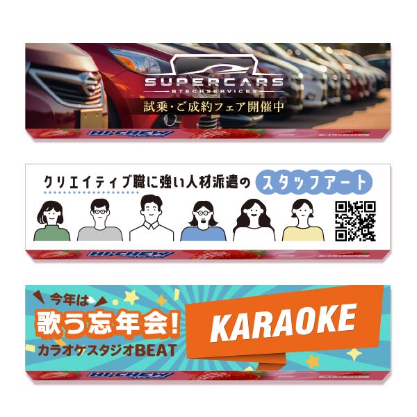 森永「ハイチュウ ストロベリー」が入った外箱を、既存レイアウトにとらわれず一からデザインできるタイプです。ブランドカラーや企画の世界観を大切にしたい方におすすめです。