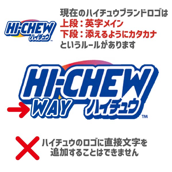 ハイチュウのラベルデザインに、許諾されていない二次創作物を使用することはできません。その他内容によりサービス利用契約に基づく判断にて製造をお断りせざるを得ない場合がありますこと予めご了承くださいます様お願い申し上げます。