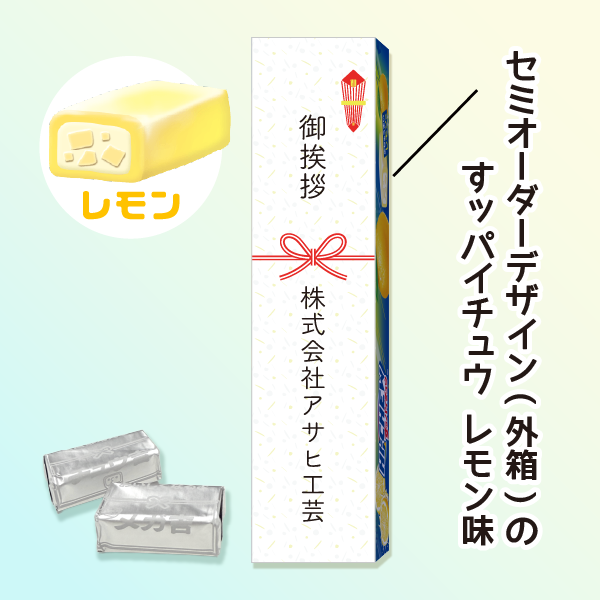 ちょっとしたご挨拶に、名入れができる“きちんと感”のあるハイチュウ。誰もが知っている森永「ハイチュウ(すッパイチュウ)レモン味」を、水引デザインのオリジナル外箱で包みました。